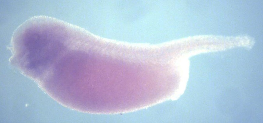 Larger Image alms1 (ALMS1, centrosome and basal body associated protein) gene expression in X. laevis embryo, assayed via in situ hybridization, NF stage 35 & 36, lateral view, anterior left, dorsal up. Copyright © Perron Lab