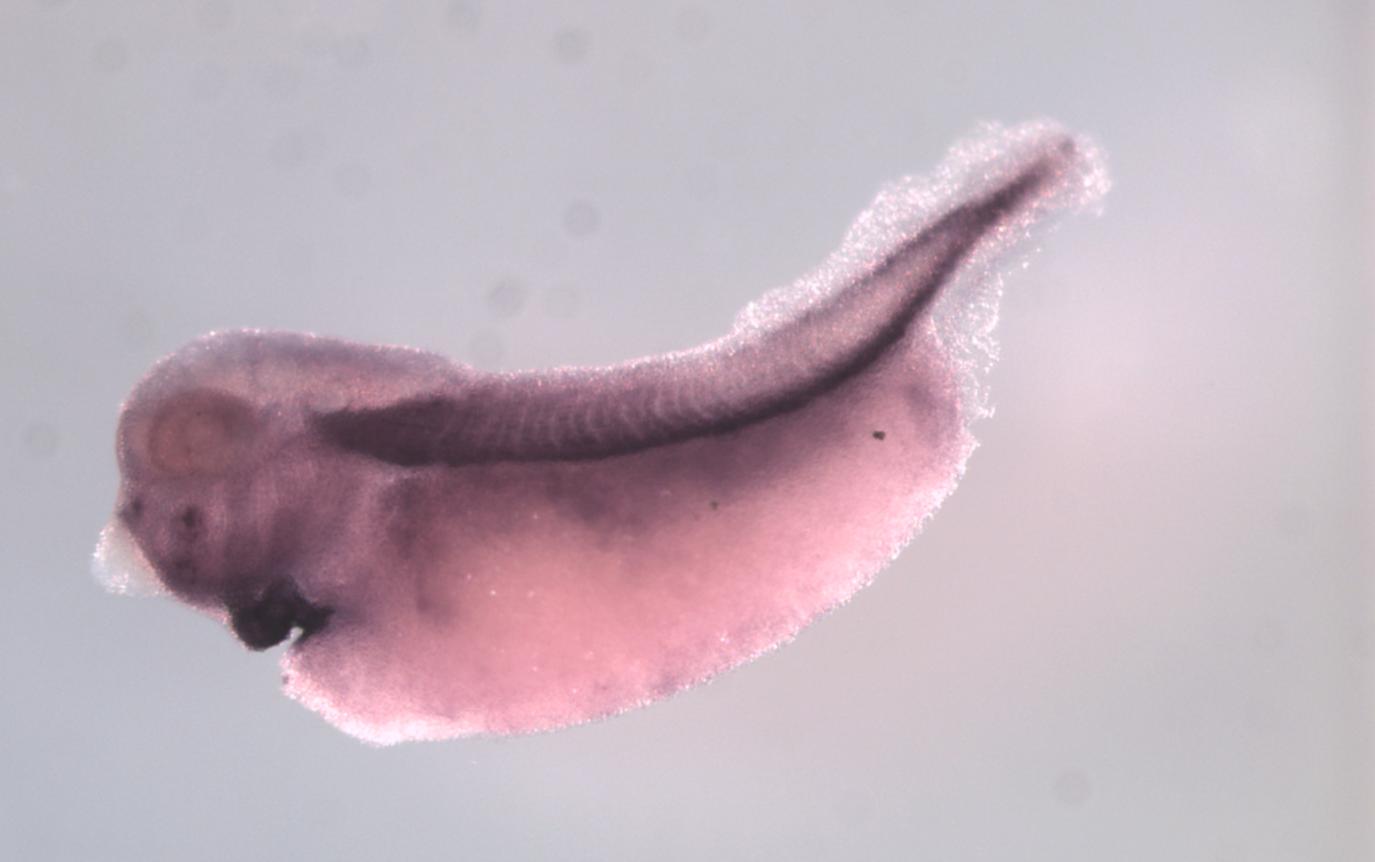 Larger Image asap3 (ArfGAP with SH3 domain, ankyrin repeat and PH domain 3) gene expression in X. laevis embryo, assayed via in situ hybridization, NF stage 35 & 36, lateral view, anterior left, dorsal up. Copyright © Perron Lab