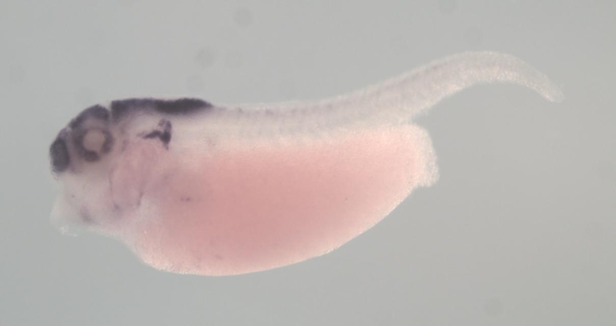 Larger Image gpc2 (glypican 2 L homeolog) gene expression in X. laevis embryo, assayed via in situ hybridization, NF stage 35 & 36, lateral view, anterior left, dorsal up. Copyright © Perron Lab
