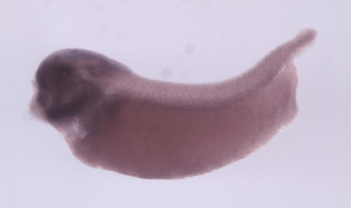 Larger Image polr2k (polymerase (RNA) II subunit K) gene expression in X. laevis embryo, assayed via in situ hybridization, NF stage 35 &36, lateral view, anterior left, dorsal up. Copyright © Perron Lab
