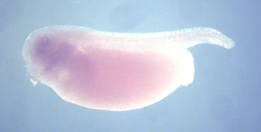 Larger Image trip12 (thyroid hormone receptor interactor 12) gene expression in X. laevis embryo, assayed via in situ hybridization, NF stage 35 & 36, lateral view, anterior left, dorsal up. Copyright © Perron Lab