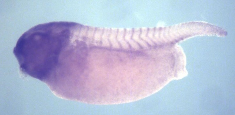 Larger Image afap1 (actin filament associated protein 1) gene expression in X. laevis embryo, assayed via in situ hybridization, NF stage 35 & 36, lateral view, anterior left, dorsal up. Copyright © Perron Lab