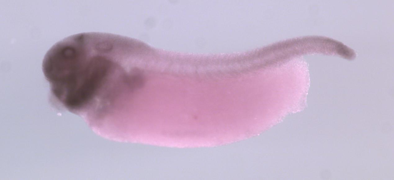 Larger Image myg1 (MYG1 exonuclease) gene expression in X. laevis embryo, assayed via in situ hybridization, NF stage 35 & 36, lateral view, anterior left, dorsal up. Copyright © Perron Lab