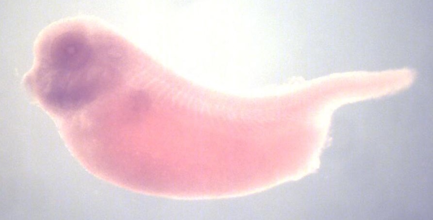 Larger Image dhrs11 (dehydrogenase/reductase (SDR family) member 11) gene expression in X. laevis embryo, assayed via in situ hybridization, NF stage 35/36, lateral view, anterior left, dorsal up. Copyright © Perron Lab