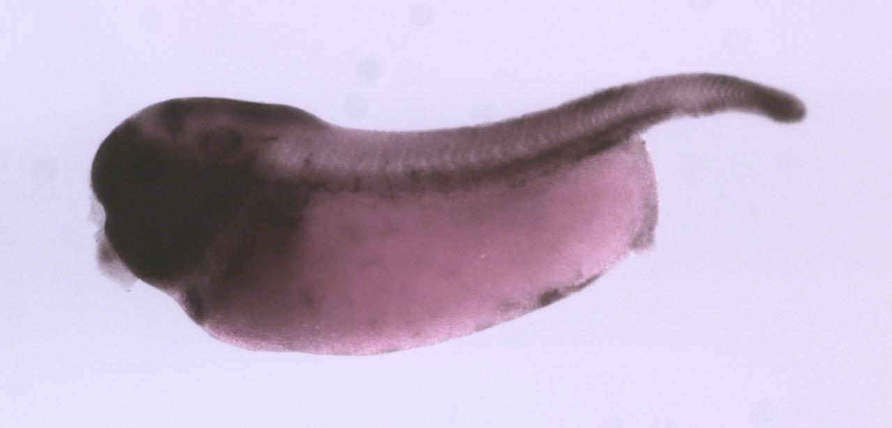 Larger Image pigm (phosphatidylinositol glycan anchor biosynthesis class M) gene expression in X. laevis embryo, assayed via in situ hybridization, NF stage 35 & 36, lateral view, anterior left, dorsal up. Copyright © Perron Lab