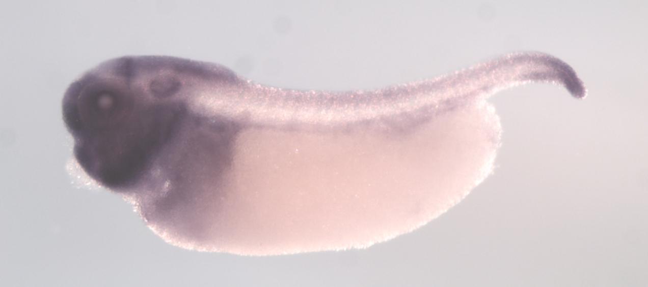 dhx38 (DEAH-box helicase 38) gene expression in X. laevis embryo, assayed via in situ hybridization, NF stage 33 & 34, lateral view, anterior left, dorsal up.