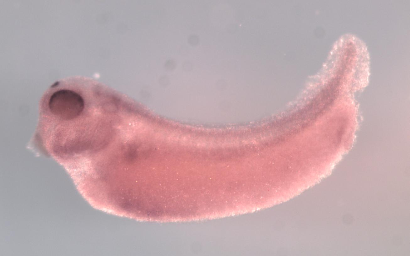 Larger Image pias3 (protein inhibitor of activated STAT 3) gene expression in X. laevis embryo, assayed via in situ hybridization, NF stage 35 & 36, lateral view, anterior left, dorsal up. Copyright © Perron Lab
