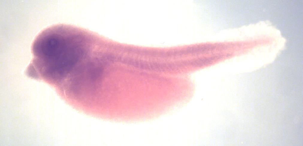 Larger Image aldh3a2 (aldehyde dehydrogenase 3 family member A2) gene expression in X. laevis embryo, assayed via in situ hybridization, NF stage 35 & 36, lateral view, anterior left, dorsal up. Copyright © Perron Lab