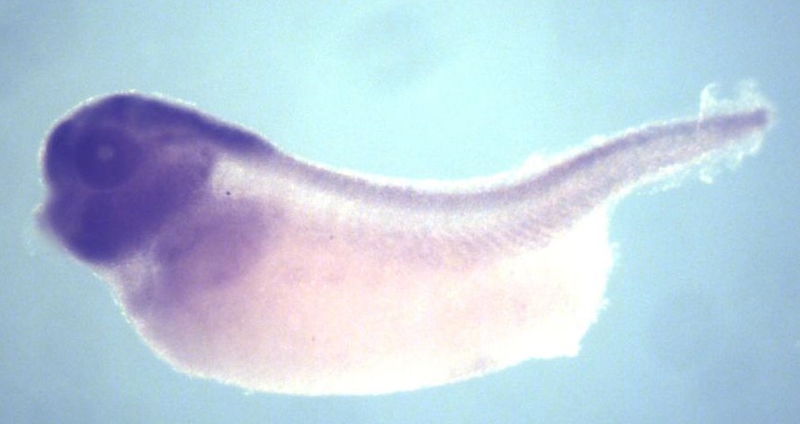 Larger Image arfgap2 (ARF GTPase activating protein 2) gene expression in X. laevis embryo, assayed via in situ hybridization, NF stage 35/36, lateral view, anterior left, dorsal up. Copyright © Perron Lab