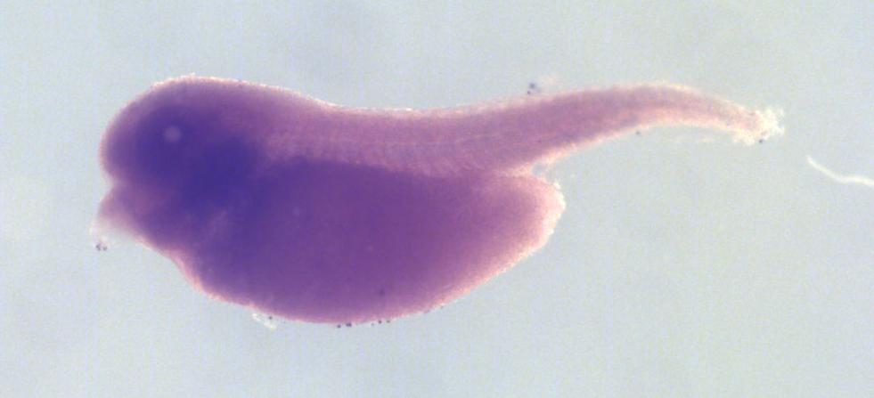 Larger Image klhl10 (kelch like family member 10 L homeolog) gene expression in X. laevis embryo, assayed via in situ hybridization, NF stage 39-40, lateral view, anterior left, dorsal up. Copyright © Perron Lab