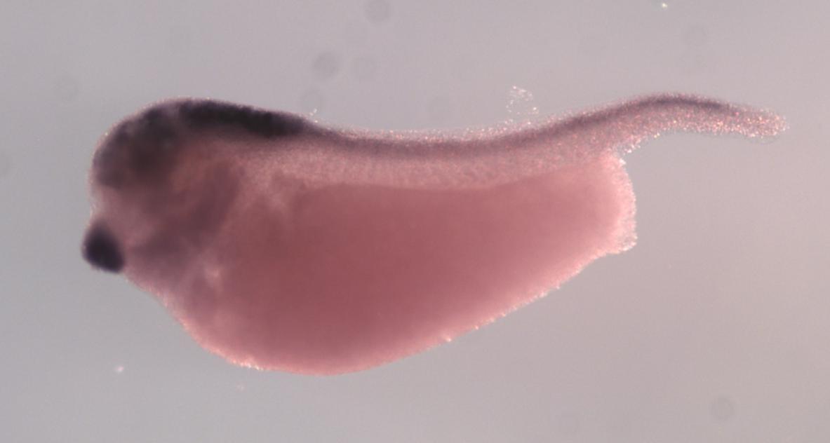 Larger Image grik2 (glutamate receptor, ionotropic, kainate 2) gene expression in X. laevis embryo, assayed via in situ hybridization, NF stage 35 & 36, lateral view, anterior left, dorsal up. Copyright © Perron Lab