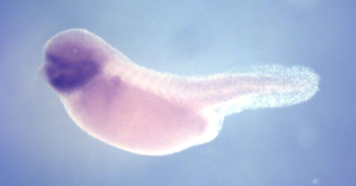 Larger Image chka (choline kinase alpha) gene expression in X. laevis embryo, assayed via in situ hybridization, NF stage 35 & 36, lateral view, anterior left, dorsal up. Copyright © Perron Lab