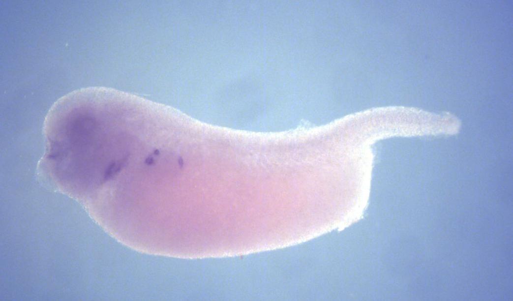 Larger Image gmcl1 (germ cell-less, spermatogenesis associated 1 L homeolog) gene expression in X. laevis embryo, assayed via in situ hybridization, NF stage 35 & 36, lateral view, anterior left, dorsal up. Copyright © Perron Lab