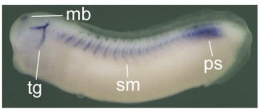 Larger Image mcam (melanoma cell adhesion molecule) gene expression in Xenopus laevis embryo, assayed via in situ hybridization, NF stage 26-32, lateral view, anterior left, dorsal up. This image is extracted from figure published in: Zhang Z et al. (2017) Copyright © 2017. Image reproduced with permission of the Publisher and the copyright holder. This is an Open Access article distributed under the terms of the Creative Commons Attribution License.
