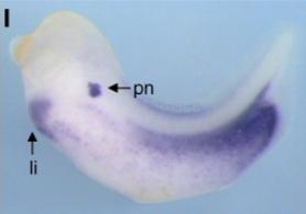 Larger Image gjb2 (gap junction protein beta 2) gene expression in Xenopus laevis, via in situ hybridization, NF stage 33 and 34 embryo, lateral view, anterior left. Image published in: de Boer TP et al. (2006) Copyright © 2006. Image reproduced with permission of the Publisher, Elsevier B. V.