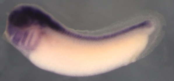 Larger Image rap2a (RAP2A, member of RAS oncogene family) gene expression in Xenopus tropicalis embryo, assayed via in situ hybridization, NF stage 28, lateral view, anterior left, dorsal up. This image is extracted from figure published in: Griffin JN et al. (2018), Image published in: Griffin JN et al. (2018) Copyright © 2018. Image reproduced with permission of the Publisher, Elsevier B. V.