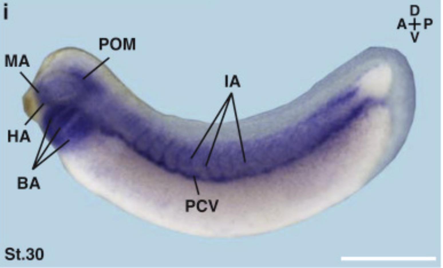 Larger Image adgra2 (adhesion G protein-coupled receptor A2) gene expression in Xenopus laevis embryo, assayed via in situ hybridization, NF stage 29 & 30, lateral view, anterior left, dorsal up. This image is extracted from figure published in: Seigfried FA et al. (2018), Image published in: Seigfried FA et al. (2018) Copyright © 2018. Image reproduced with permission of the Publisher, Elsevier B. V.