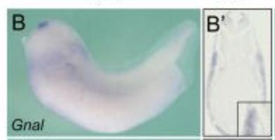 Larger Image gnal (G protein subunit alpha L) gene expression in Xenopus laevis embryo, assayed via in situ hybridization, NF stage 35, lateral view, anterior left, dorsal up. Inset of paraplast section shows close-up of the pronephric kidney. This image is extracted from figure published in: Zhang B et al. (2018) Copyright © 2018. Image reproduced with permission of the Publisher and the copyright holder. This is an Open Access article distributed under the terms of the Creative Commons Attribution License.