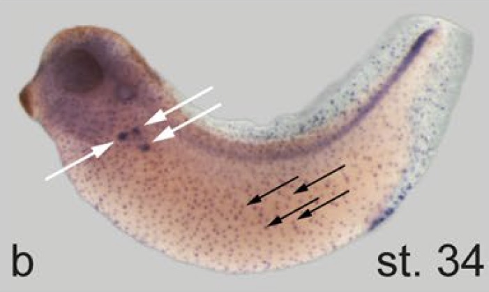 Larger Image fam183b (family with sequence similarity 183, member B) gene expression in Xenopus laevis embryo, assayed via in situ hybridization, NF stage 34, lateral view, anterior left, dorsal up. This image is extracted from figure published in: Beckers A et al. (2018), Image published in: Beckers A et al. (2018) © The Author(s) 2018. Creative Commons Attribution license