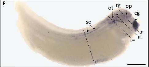 Larger Image trpv2 (transient receptor potential cation channel, subfamily V, member 2) gene expression in Xenopus laevis embryo, assayed via in situ hybridization, NF stage 35, lateral view, anterior right, dorsal up. This image is extracted from figure published in: Dong C et al. (2018) Copyright © 2018. Image reproduced with permission of the Publisher, Elsevier B. V.