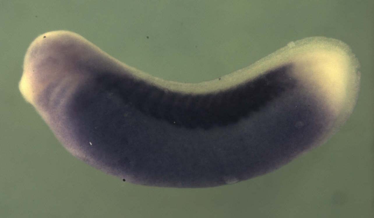cdh15 gene expression in Xenopus laevis embryo via in situ hybridization, NF stage 27, lateral view, anterior left.