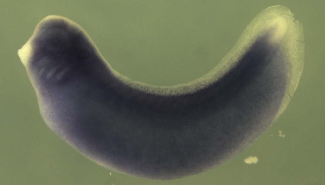RAB25 gene expression in Xenopus laevis embryo via in situ hybridization, NF stage 32, lateral view, anterior left.