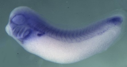Larger Image foxc1 (forkhead box C1) gene expression in Xenopus tropicalis embryo, assayed via in situ hybridization, NF stage 28, lateral view, anterior left, dorsal up Copyright © Harland lab in situ screen