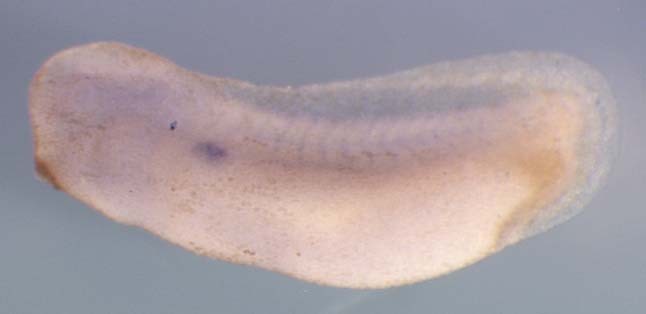 Larger Image snrp70 gene expression in Xenopus tropicalis embryo via in situ hybridization, NF stage 28, lateral view, anterior left. Copyright © Papalopulu Lab, Nancy Papalopulu Copyright © Papalopulu Lab