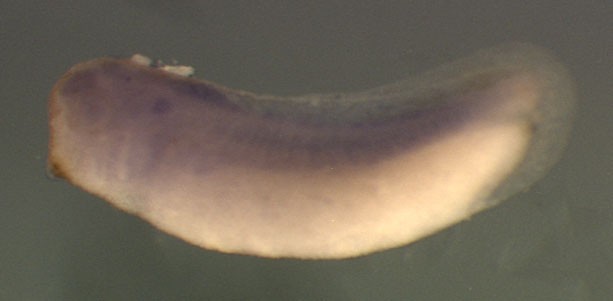 Larger Image tfb1m (transcription factor B1, mitochondrial) gene expression in Xenopus tropicalis embryos, NF stage 28, as assayed by in situ hybridization. Lateral view: anterior left, dorsal up. Copyright © Papalopulu Lab