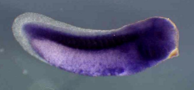 Larger Image ocm.2 (oncomodulin) gene expression in X. tropicalis embryo, assayed via in situ hybridization, NF stage 28, lateral view, anterior right, dorsal up. Copyright © Papalopulu Lab