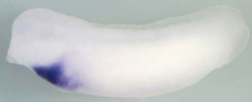 Larger Image GATA binding protein 5 (gata5) gene expression in Xenopus tropicalis embryo, assayed via in situ hybridization, NF stage 28/29, lateral view, anterior left, dorsal up. Copyright © Harland Lab