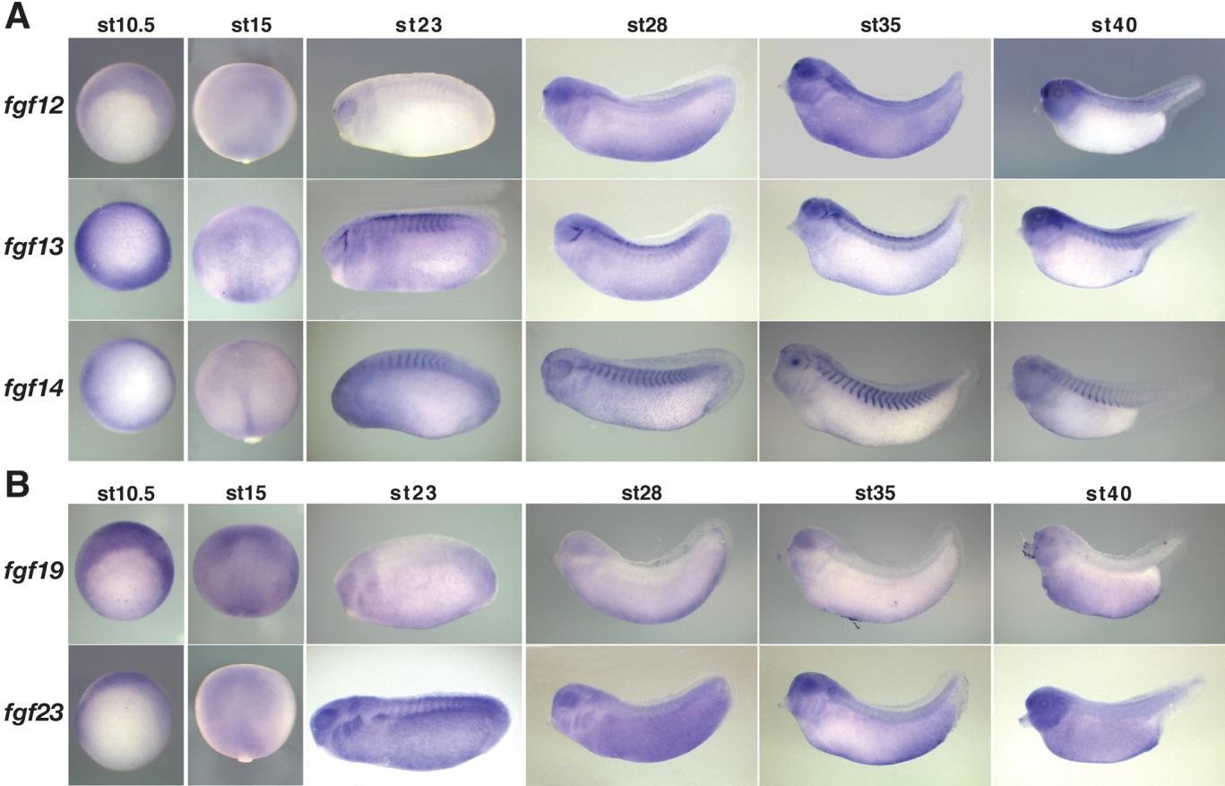 Figure 6. Analysis of the spatial expression patterns of the intracellular fgfs and hormone-like fgfs subfamilies. A: Whole mount in situ hybridisations of fgf12, fgf13, and fgf14 at the indicated stages. B: Whole mount of the hormone-like fgfs at the indicated stages. For stage 10.5, the images are vegetal views; for stage 15, the images are dorsal views; and for stage 23, 28, 35, and 40, the images are lateral views (anterior is left, posterior is right, dorsal is up, and ventral is down). A schematic representation of a Xenopus embryo at stage 28 with the different embryonic tissues labelled is presented in Supp. Figure S3.