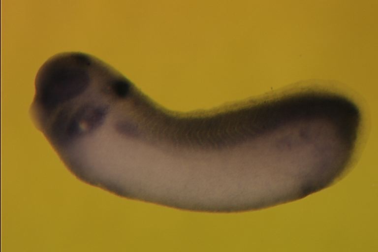 gcat gene expression in Xenopus laevis embryo via in situ hybridization, NF stage 28, lateral view, anterior left.