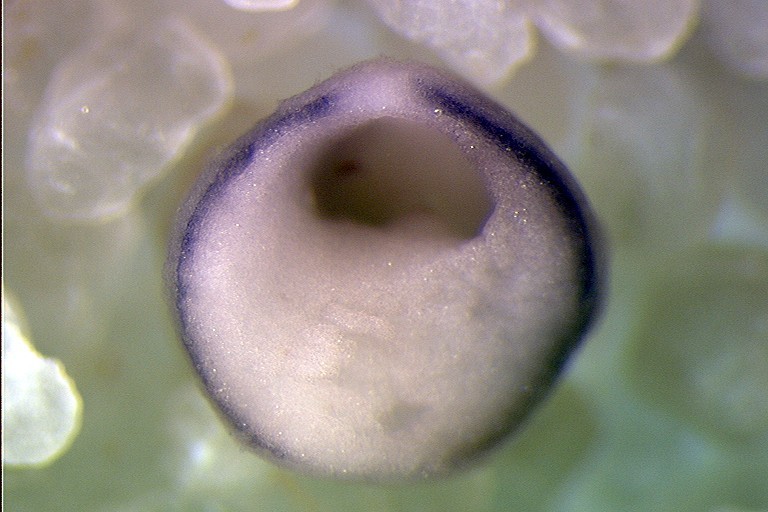 gene expression in Xenopus laevis embryo via in situ hybridization, NF stage 13, bisected embryo, dorsal top.