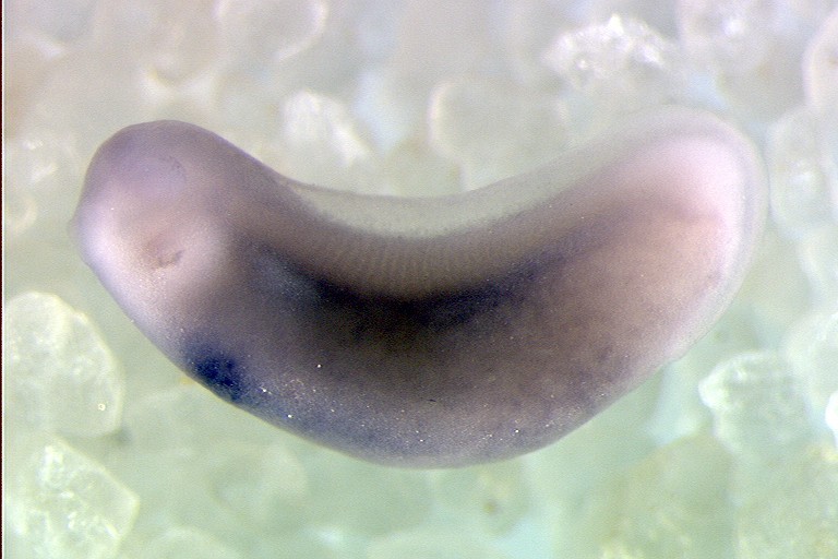 hao1 gene expression in Xenopus laevis embryo via in situ hybridization, NF stage 28, lateral view, anterior left.