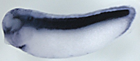 Larger Image col2a1 (collagen, type II, alpha 1) gene expression in Xenopus tropicalis embryo, NF stage 28, as assayed via in situ hybridization, lateral view, anterior left, dorsal up. Copyright © Harland Lab Image published in: Harland