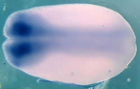 Larger Image sox1 (SRY (sex determining region Y)-box 1 ) gene expression in Xenopus tropicalis embryo via in situ hybridization, NF stage 20, dorsal view, anterior left. Image copyrighted by: copyrighted by: Harland Lab. Copyright © Harland Lab Image published in: Harland
