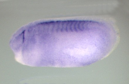 Larger Image fgf13 (fibroblast growth factor 13) gene expression in Xenopus tropicalis embryo, assayed via in situ hybridization, NF stage 23, lateral view, anterior left, dorsal up. This image is extracted from figure published in: Lea R et al. (2009), Image published in: Lea R et al. (2009) Copyright © 2009. Image reproduced with permission of the Publisher, John Wiley & Sons.