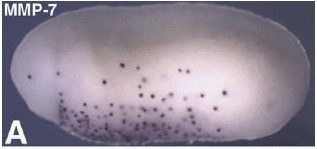 Larger Image mmp7 (matrix metallopeptidase 7) gene expression in Xenopus laevis embryo, assayed via in situ hybridization, NF stage 24, lateral view, anterior left, dorsal up. Image published in: Tomlinson ML et al. (2008) Copyright © 2008. Image reproduced with permission of the Publisher, Elsevier B. V.