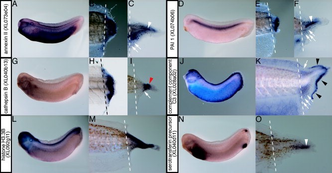 Figure 3. Whole mount in situ hybridization of up-regulated genes, grouped according to function as wound healing, inflammation response, and cell proliferation genes. Tailbud stage embryo (A, D, G, J, L, N), regenerating tail on day 2 (B, E, H), and regenerating tail on day 5 (C, F, I, K, M, O) were hybridized with DIG-labeled RNA probes. Lateral view, dorsal side up, anterior to the left. White arrowheads, notochord; white arrows, blood cells; red arrowhead, uncharacterized cells; black arrowheads, wound epidermis; broken line, the plane of amputation. AâC: Expression of annexin II (XL073e04). DâF: Expression of PAI1 (XL074b06). GâI: Expression of cathepsin B (XL040b13). J, K: Expression of complement component C3 (XL028a02). L, M: Expression of histone H3.3B (XL092g11). N, O: Expression of serotransferrin precursor (XL040d11).