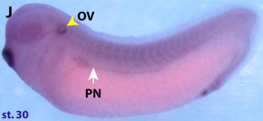 Larger Image shroom1 ( shroom family member 1 ) gene expression in Xenopus laevis embryos, NF stage30, as assayed by in situ hybridization. Lateral view: Dorsal up, anterior left. Copyright Wiley-Liss , 2009 Image published in: Lee C et al. (2009) Copyright © 2009. Image reproduced with permission of the Publisher, John Wiley & Sons.