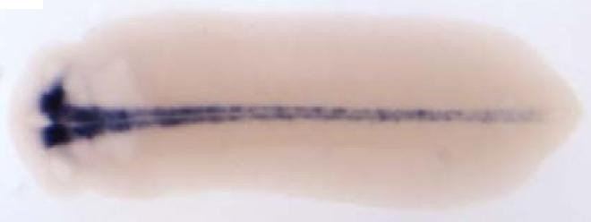 Larger Image nkx2.2 (NK2 homeobox 2 ) gene expression in Xenopus laevis embryos, NF stage 24, as assayed by in situ hybridization, dorsal view, anterior left. This image is extracted from figure published in: Chung MI et al. (2012), Image published in: Chung MI et al. (2012) Copyright © 2012. Image reproduced with permission of the Publisher, Elsevier B. V.