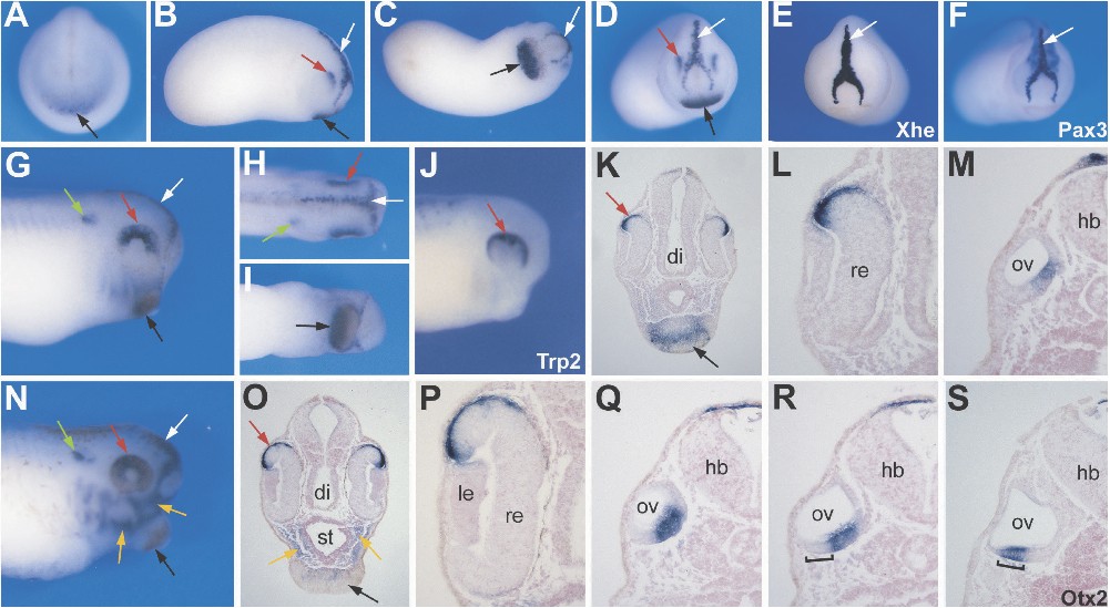 Larger Image Fig. 2. Expression of CXCL14 by whole-mount in situ hybridization. (A) Onset of CXCL14 expression at stage 20 in the prospective cement gland anterior to the neural plate (black arrow). Frontal view, dorsal to top. (B-D) At stage 23 CXCL14 is detected in part of the cement gland (black arrows), the dorsal anterior portion of the optic vesicle (red arrows) and the hatching gland (white arrows). (B) Lateral view, dorsal to top, anterior to right. (C) Ventral view, anterior to right. (D) Frontal view, dorsal to top. The expression of Xhe (E) and Pax3 (F) in the hatching gland (white arrows) at this stage are shown for comparison. (E-F) Frontal view, dorsal to top. (G-I) CXCL14 expression at stage 28. In addition to the cement gland (black arrows), optic vesicle (red arrows) and hatching gland (white arrows), CXCL14 is also detected in the otic vesicle (green arrows). (G) Lateral view, dorsal to top, anterior to right. (H) Dorsal view, anterior to right. (I) Ventral view, anterior to right.(J) The expression pattern of Trp2 in the pigmented epithelium of the retina is similar to CXCL14 expression in the developing eye (red arrow). Lateral view, dorsal to top, anterior to right. (K-L) Transverse section highlights the expression of CXCL14 expression in the pigmented epithelium of the retina (red arrow). Panel (L) is a higher magnification view of panel (K). CXCL14 expression is restricted to the ventral medial aspect of the otic vesicle (M). (N) At stage 35, CXCL14 expression persists in the same domains and is also detected in the head mesenchyme (yellow arrows). Lateral view, dorsal to top, anterior to right. (O-R) Transverse sections showing the expression of CXCL14 in the head mesenchyme and the cement gland (O), pigmented epithelium of the retina (O-P) and otic vesicle (Q-R). Panel (Q) corresponds to a section posterior to section shown in panel (R). For comparison at this stage Otx2 (bracket) is expressed in the ventral aspect of the otic vesicle (S) a domain that does not overlap with CXCL14 (R). di, diencephalon; hb, hindbrain; le, lens; ov, otic vesicle; re, retina; st,stomodeum. Image published in: Park BY et al. (2009) Copyright © 2009. Image reproduced with permission of the Publisher, University of the Basque Country Press.