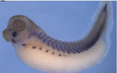 Larger Image myos (myoskeletin) gene expression in Xenopus laevis embryo via in situ hybridization, NF stage 38, lateral view, anterior left, dorsal up. This image is extracted from figure published in: Zhao H et al. (2007), Image published in: Zhao H et al. (2007) Copyright © 2007. Image reproduced with permission of the Publisher, University of the Basque Country Press.