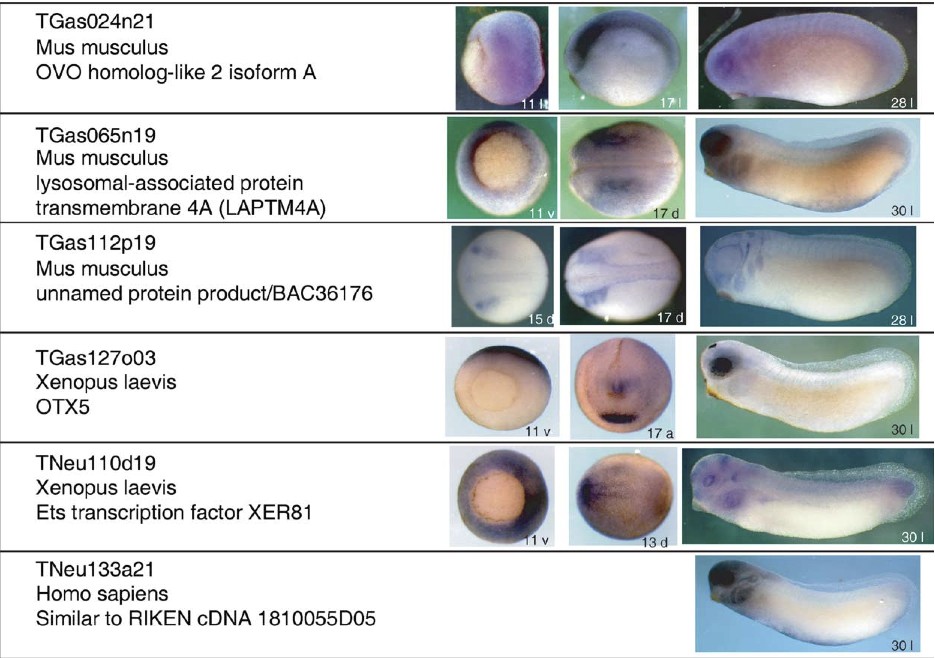 Larger Image Fig. 10. Regionalized expression pattern of clones giving rise to extra axis. Six clones from this synphenotype group gave rise to restricted expression patterns. The images are ordered by clone name. For each clone the species and annotation of the closest matching blastx hit is shown. Abbreviations are: a, anterior view (stage 17); d, dorsal view (stage 13 and 17); l, lateral view (stage 11, 28 and 30); v, vegetal view (stage 11). Image published in: Chen JA et al. (2005) Copyright © 2005. Image reproduced with permission of the Publisher, Elsevier B. V.Gene Synonyms Species Stage(s) Tissue ovol2 LOC108716629, LOC108717773 X. tropicalis Throughout NF stage 11 animal cap laptm4a laptm4, laptm4a-a, laptm4a-b, mbnt, mtrp X. tropicalis Throughout NF stage 11 marginal zone crx crx-a, crx-b, otx5, otx5b, Xotx5, Xotx5b X. tropicalis Throughout NF stage 11 dorsal ectoderm etv1 er81, XER81 X. tropicalis Throughout NF stage 11 marginal zone etv1 er81, XER81 X. tropicalis Throughout NF stage 13 neural plate presumptive midbrain-hindbrain boundary inka1 c3orf54, card17, fam212a, inca X. tropicalis Throughout NF stage 15 cranial neural crest preplacodal ectoderm posterior placodal area ovol2 LOC108716629, LOC108717773 X. tropicalis Throughout NF stage 17 mesoderm prechordal plate laptm4a laptm4, laptm4a-a, laptm4a-b, mbnt, mtrp X. tropicalis Throughout NF stage 17 lateral plate mesoderm inka1 c3orf54, card17, fam212a, inca X. tropicalis Throughout NF stage 17 pre-chordal neural plate neural plate border neural fold crx crx-a, crx-b, otx5, otx5b, Xotx5, Xotx5b X. tropicalis Throughout NF stage 17 cement gland primordium neural plate ovol2 LOC108716629, LOC108717773 X. tropicalis Throughout NF stage 28 otic vesicle eye retina inka1 c3orf54, card17, fam212a, inca X. tropicalis Throughout NF stage 28 pharyngeal arch mandibular arch hyoid arch branchial arch midbrain-hindbrain boundary profundal placode trigeminal nerve facial nerve laptm4a laptm4, laptm4a-a, laptm4a-b, mbnt, mtrp X. tropicalis Throughout NF stage 29 and 30 forebrain pharyngeal arch crx crx-a, crx-b, otx5, otx5b, Xotx5, Xotx5b X. tropicalis Throughout NF stage 29 and 30 eye pineal gland etv1 er81, XER81 X. tropicalis Throughout NF stage 29 and 30 pharyngeal arch tail bud eye brain midbrain-hindbrain boundary midbrain olfactory bulb pronephric mesenchyme dnajc19 LOC549696 X. tropicalis Throughout NF stage 29 and 30 otic vesicle pharyngeal arch branchial arch eye brain forebrain midbrain hindbrain cranial placode cephalic nerve cranial nerve lateral line placode