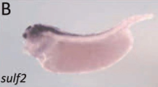 Larger Image sulf2 (sulfatase 2) gene expression in Xenopus tropicalis embryos, NF stage 39, as assayed by in situ hybridization, lateral view, anterior left, dorsal up. This image is extracted from figure published in: Parain K et al. (2012), Image published in: Parain K et al. (2012) Copyright © 2012. Image reproduced with permission of the Publisher, John Wiley & Sons.