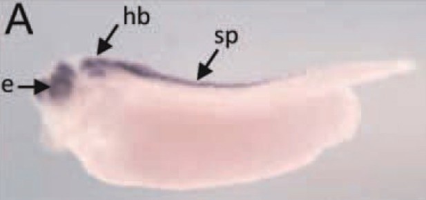 Larger Image slc1a2 (solute carrier family 1 (glial high affinity glutamate transporter), member 2 ) gene expression in Xenopus tropicalis embryos, NF stage 39, as assayed by in situ hybridization, lateral view,anterior left, dorsal up. This image is extracted from figure published in: Parain K et al. (2012), Image published in: Parain K et al. (2012) Copyright © 2012. Image reproduced with permission of the Publisher, John Wiley & Sons.