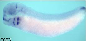 Larger Image fgf3 (fibroblast growth factor 3) gene expression in Xenopus tropicalis embryo, assayed via in situ hybridization, NF stage 28, lateral view, anterior left, dorsal up. This image is extracted from figure published in: Guiral EC et al. (2010), Image published in: Guiral EC et al. (2010) Copyright © 2010. Image reproduced with permission of the Publisher, Elsevier B. V.