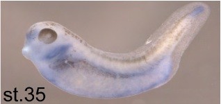 Larger Image h3-3a (H3.3 histone A) gene expression in Xenopus laevis embryo, assayed via in situ hybridization, NF stage 35, lateral view, anterior left, dorsal up. This image is extracted from figure published in: Lim CY et al. (2013), Image published in: Lim CY et al. (2013) Copyright © 2013. Image reproduced with permission of the Publisher.