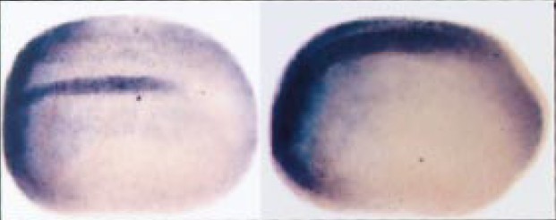 Larger Image syngr1 (synaptogyrin 1) gene expression in Xenopus laevis embryos, NF stage 13, as assayed by in situ hybridization. Left image: dorsal view, anterior left. Right image: lateral view of bisected embryo: anterior left, dorsal up. This image is extracted from figure published in: Shibata M et al. (2001), Image published in: Shibata M et al. (2001) Copyright © 2001. Image reproduced with permission of the Publisher, Elsevier B. V.